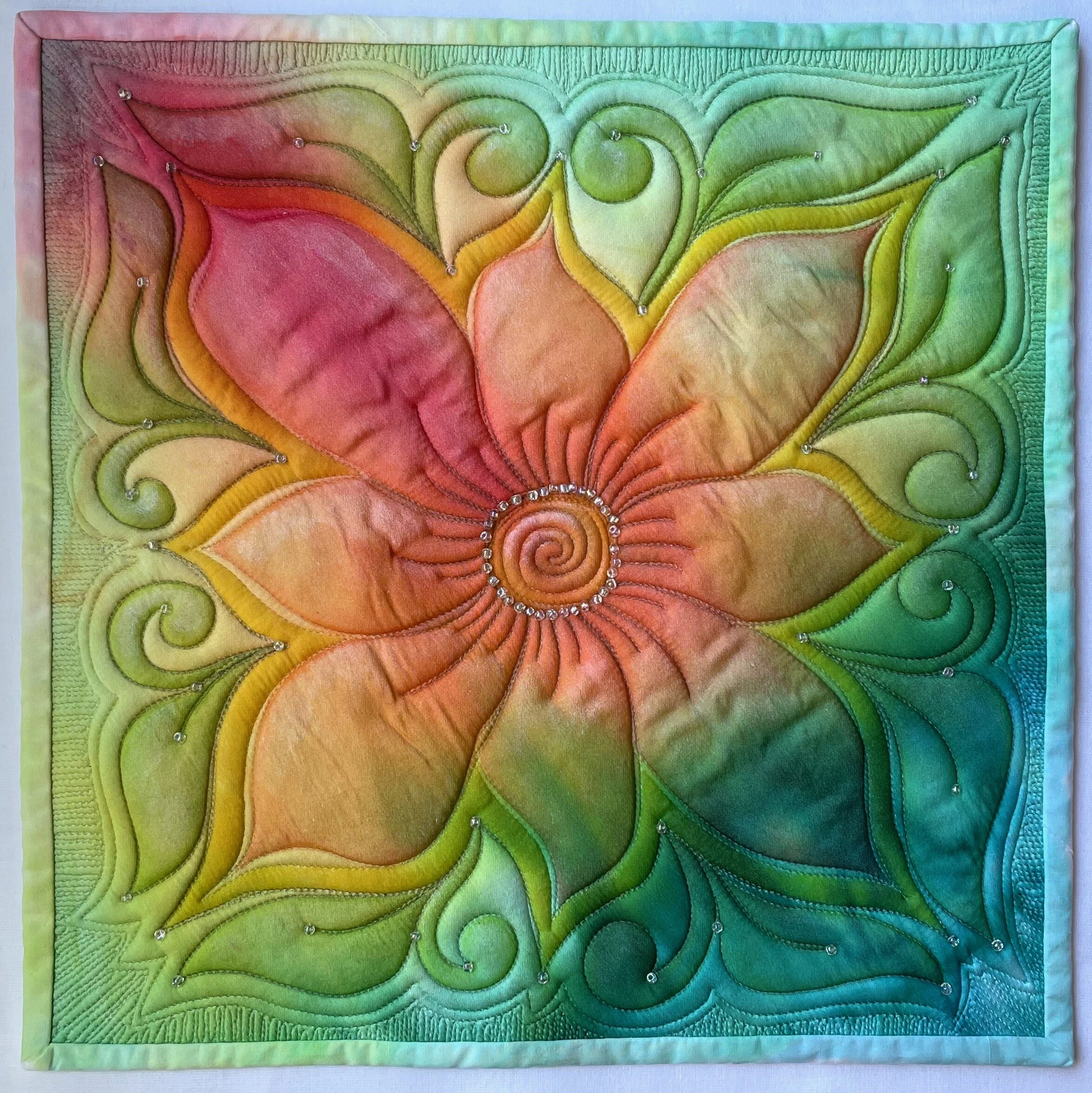 12”x12”, hand-painted silk, longarm quilted, embellished with hand-stitched beads.